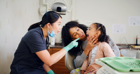 Dentist, mother and child in consultation with inspection for oral hygiene, healthcare or wellness. Dental hygienist, mom and daughter in office for mouth examination, medical assistance or pointing.