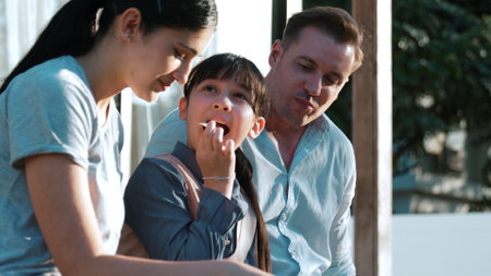 Lovely marriage couple and daughter picnic at outdoor terrace. Family using outdoor activity show love and care to strengthen good growth for child, strong family bond or relationship. Divergence.