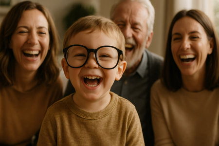Joyful child wearing large glasses shares a moment of laughter with family members, creating a warm and happy atmosphere in a cozy home setting