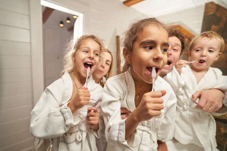Family Concepts. Young VCaucasian Fa,ily with The Kids Having Fun in Bathroom While Brushing Teeth Together. Horizointal Image Orientation