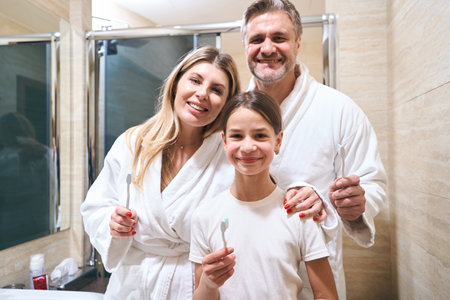 Parents and daughter brushing their teeth in the bathroom at home