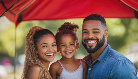 A radiant family stands together in a sunlit park, their smiles illuminating the scene with warmth and happiness. The little girl, nestled between her parents, beams with joy, embodying the pure essence of love and togetherness in this picturesque moment.