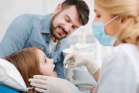 Dental drill close-up. Child dentist drilling teeth of kid girl in dentistry clinic. Teeth treatment. Dental filling for child patient