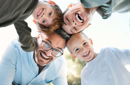 Faces of happy caucasian family from above. Top view portrait of cheerful young family with two sons lying together while looking up at camera. Married couple with children