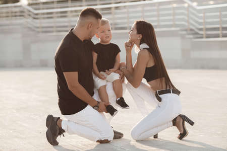 Young family with a child on a walk in the city in summer. Love and trust as family values. Mother and father with son outdoor. Summer vacation of happy family. Child with father and mother. Family with small kid on mothers or fathers day.