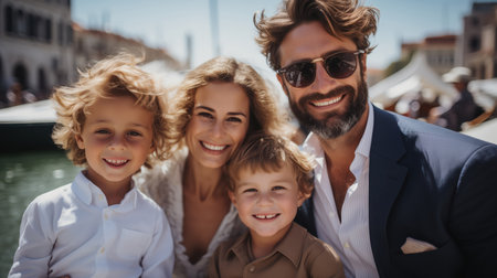 A happy family of four enjoying a moment together outdoors