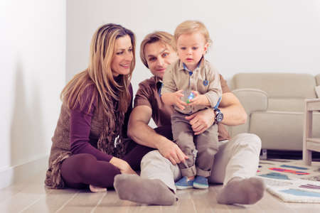 Happy family sitting on floor with their little baby. Family spending time at home with their son.
