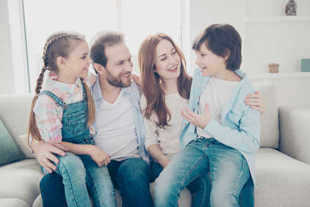 Cozy warm loving caring family of four at home together, happy parents and kids laughing having fun sitting on sofa, young married couple playing with preschool smiling son and daughter on couch