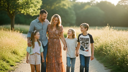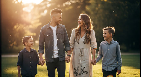 A happy family of four walking hand in hand outdoors during sunset