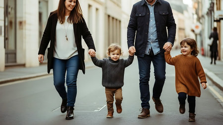 A happy family of four holding hands and walking together in a park