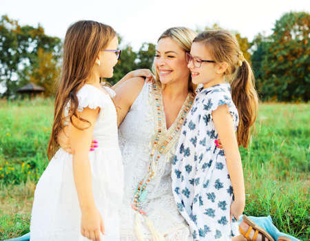 Portrait of a happy family walking in the park at sunset.