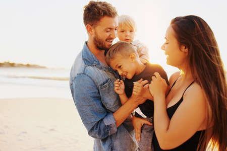 Happy mixed race family standing on the beach. Loving parents kissing adorable little son on the cheeks showing love and affection while enjoying beach vacation