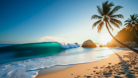 Stunning sunrise scene on a tranquil tropical beach featuring a gently swaying palm tree, waves crashing on the shore, and golden sunlight reflecting on the ocean. ideal for summer vacation themes, travel brochures, and relaxation designs.
