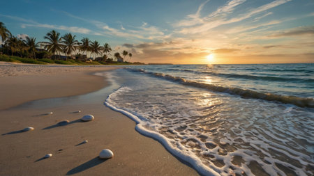 A serene tropical beach at sunset, with palm trees gently swaying in the breeze. The sun casts a warm golden glow over the sand and waves, creating a tranquil and picturesque scene.