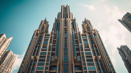 Symmetrical glass skyscraper with numerous windows standing proudly in urban city skyline