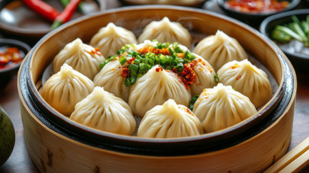 A bamboo steamer filled with steaming dumplings sits invitingly on a dining table, complemented by sauces and a warm ambiance, reflecting culinary artistry.
