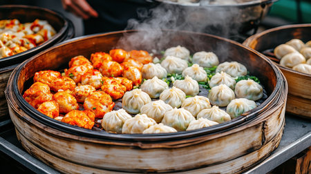 AI Generated. Assorted Dumplings in Bamboo Steamer with Fresh Vegetables