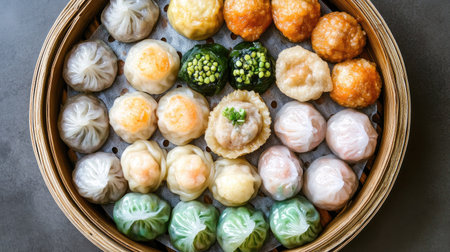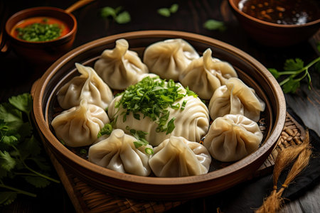 dumplings arranged in a bamboo steamer, created with generative ai