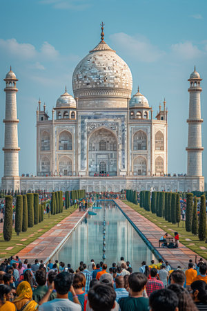 Iconic with its white marble dome, reflecting pool, and lush gardens under a clear blue sky
