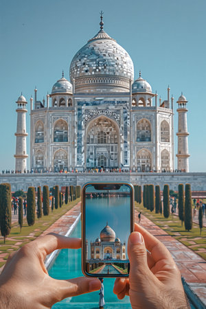 Hands holding a smartphone capturing the iconic , perfectly framing its majestic dome, minarets, and reflection in the central waterway under a clear blue sky