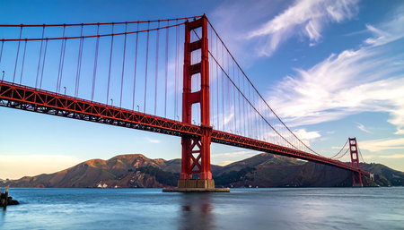 A stunning image capturing the Golden Gate Bridge at sunset with the San Francisco skyline in the background, highlighting the iconic architecture and serene water below. This photo emphasizes beauty, tranquility, and architectural brilliance. AI generated image