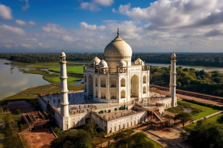 Taj Mahal ivory white marble mausoleum under blue sky, famous landmark great architecture located in Agra, Uttar pradesh, India.