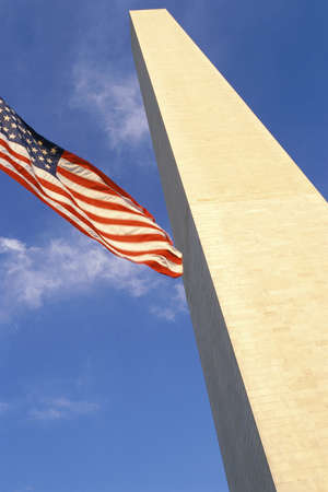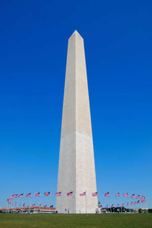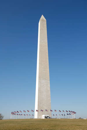 Full view of the Washington Monument in Washington DC against rich blue sky, flags around it