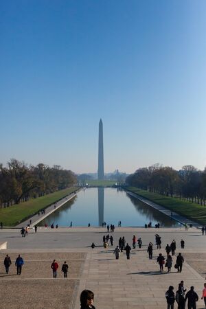 Washington Monument with the mirror lake which reflect the obelisk shadow in the front and covered with people in the foreground