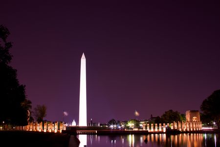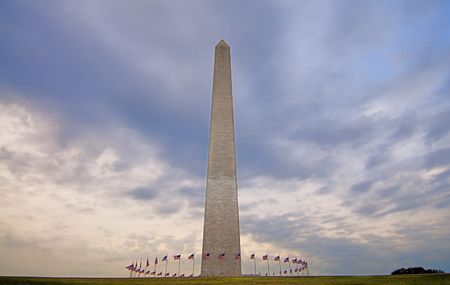 The Washington Monument is a large, white-colored obelisk at the west end of the National Mall in Washington, D.C. It is a United States Presidential Memorial constructed for George Washington.