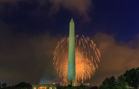Washington DC, USA - July 04, 2015: Washington Monument stands tall with Fourth of July Fireworks in background.
