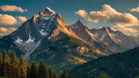 Beautiful mountain landscape with snow-capped peaks at sunset.