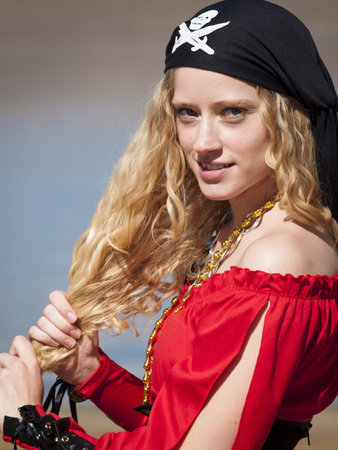 A woman in pirate attire gazes thoughtfully from the deck of a ship, with ropes and sails in view.