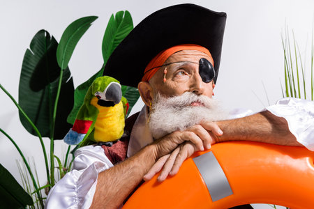 Elderly pirate character dressed as a buccaneer with colorful parrot on shoulder, surrounded by tropical plants, white background