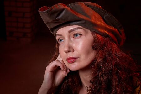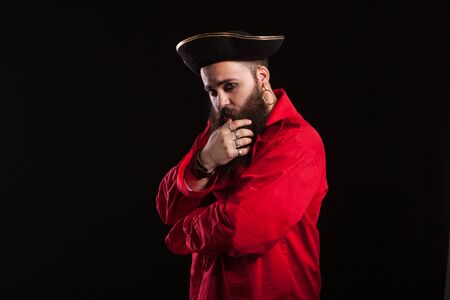 Portrait of a medieval bearded pirate thoughtfully looking up on a black background.
