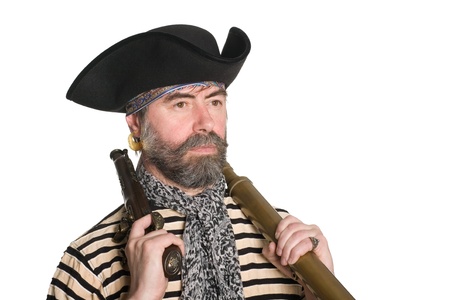 Side view portrait of handsome young man in a pirate costume for halloween carnival. Man in vintage sailor costume.