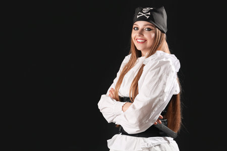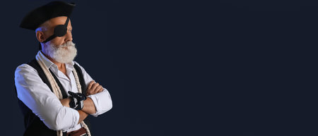 Adult pirate captain in a traditional costume and with arms looks at a treasure map against the backdrop of a jolly roger