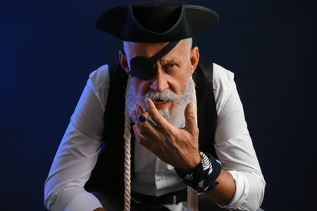 Close-up portrait muscular pirate in the studio on a dark background. Man looking away