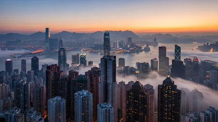 Hong Kong city skyline at sunset with fog over Victoria harbor, China