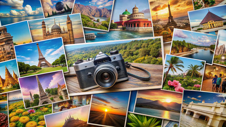 Colorful collage of travel memories featuring iconic landmarks, scenic vistas, and vintage items, surrounded by a digital camera and scattered photographs.