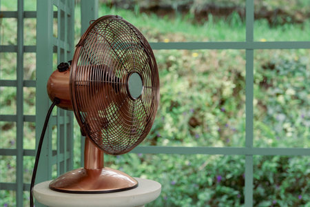 Vintage desk fan is blowing air, providing relief from the heat