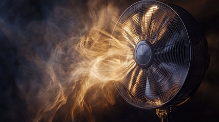 This image showcases an electric fan emitting smoke, creating an intriguing visual effect against a dark background. The lighting highlights the details of the fan while emphasizing the movement of the smoke.