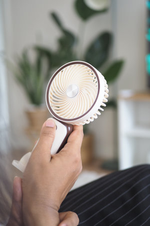 Young woman cooling off with handheld fan in hot weather at outdoor park during summer