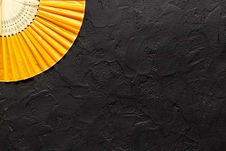 Colorful background with fan in yellow and blue colors. Minimalistic summer concept.