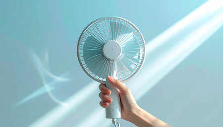 A white electric fan is held by a hand against a bright blue background with diagonal light streaks.