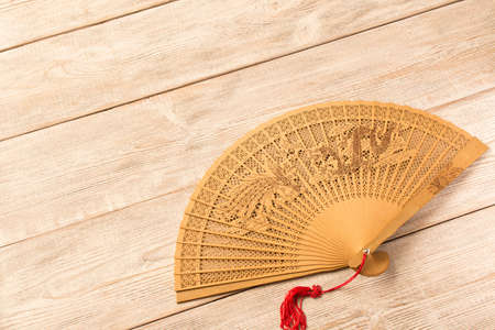 A close-up of a Chinese fan with delicate hand-painted designs. No people, copy space.