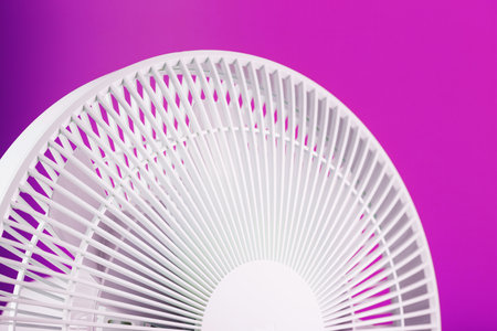 Modern violet electric fan in a living room saving peoples from hot temperature in summer days.