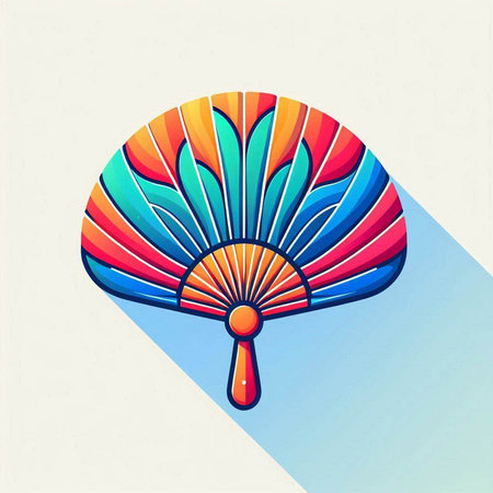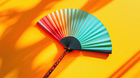 A stunning colorful Japanese fan lies gracefully against a bright yellow background, casting playful shadows. Ideal for cultural or design themes.