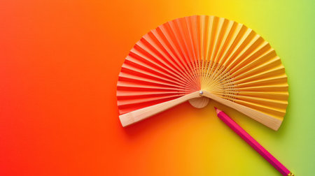 This image features a vibrant orange folding fan alongside a matching pencil, set against a colorful gradient background. Ideal for creative projects.