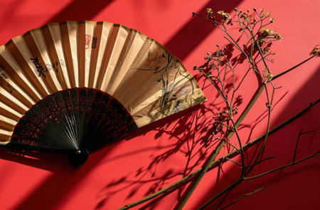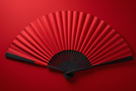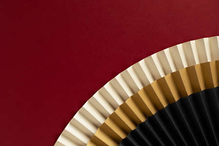 Template with paper fans over red background, Chinese New Year, Christmas, New year Background. Mockup for product presentation, flat lay, top view