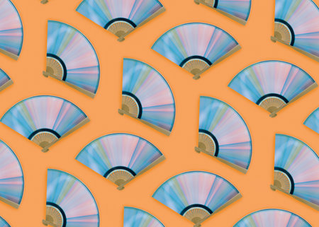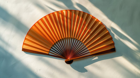 A decorative fan rests on a bright surface showcasing its intricate designs and contrasting colors of orange and blue in an artistic arrangement.